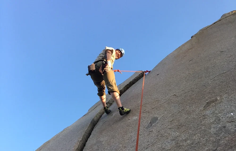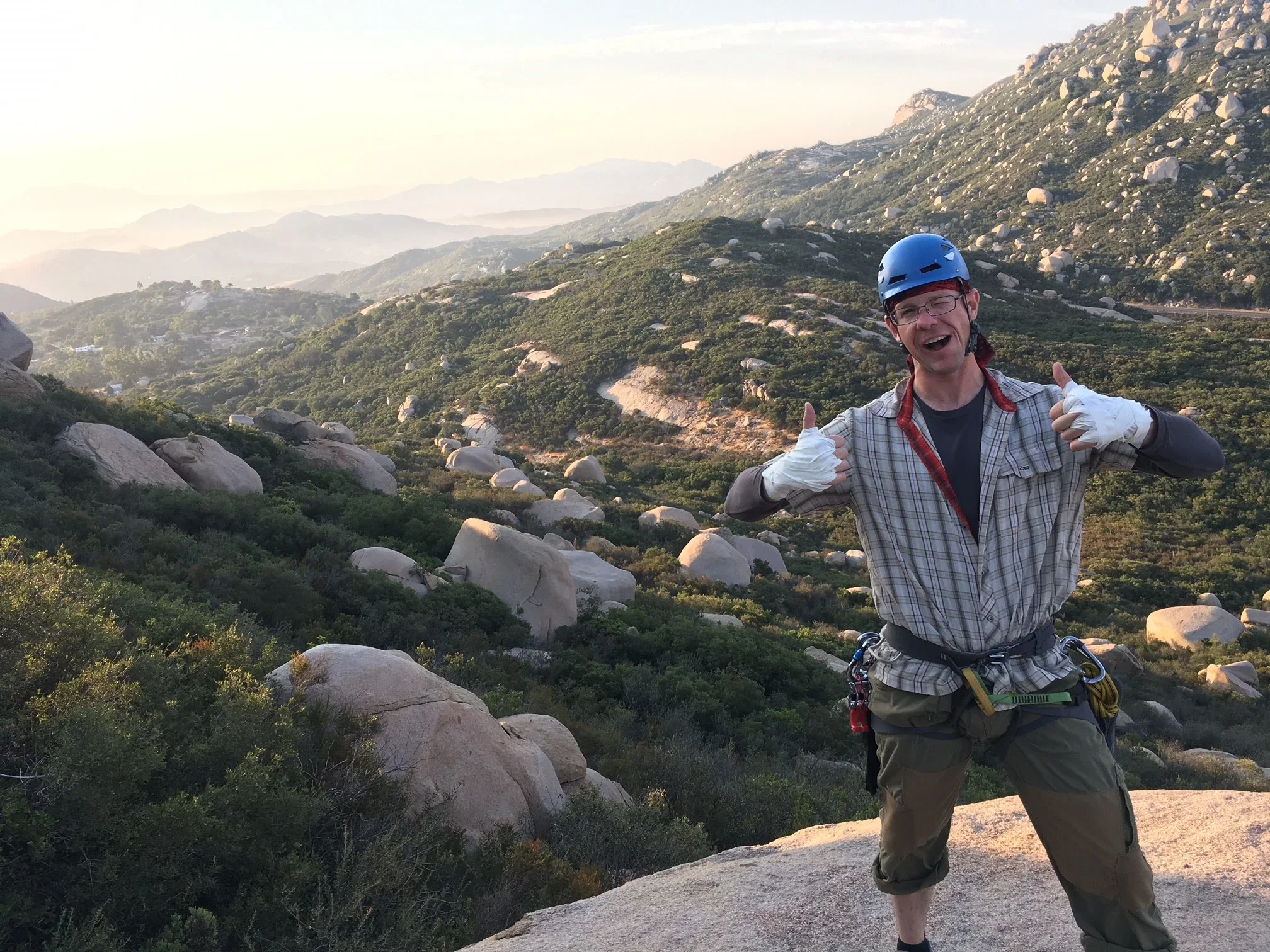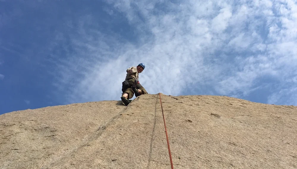 Golden State Guiding teamed up with partner Vertical Hold Climbing Gym for two days of outdoor rock climbing in San Diego for the month of July. Our first outing took place at Mt. Woodson this past Sunday and it sure was hot! Nevertheless we took to the hill and had a great time on some classic cracks! Here, experienced climber Brian Rau demonstrates his stoke for the sport. It was all tape gloves and smiles out there!