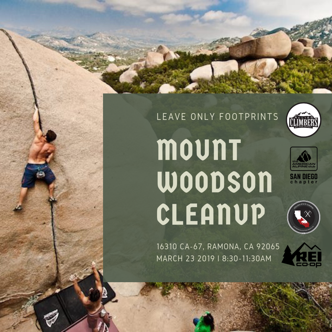 Attention all climbers! The annual Mount Woodson Cleanup is happening Saturday, March 23rd from 8:30 am - 11:30 am! Come out and join Allied Climbers of San Diego, the American Alpine Clubs San Diego Chapter, REI and us for a day of stewardship, socializing, coffee sipping and doughnut devouring! Click the button below to learn more. See you on the hill!