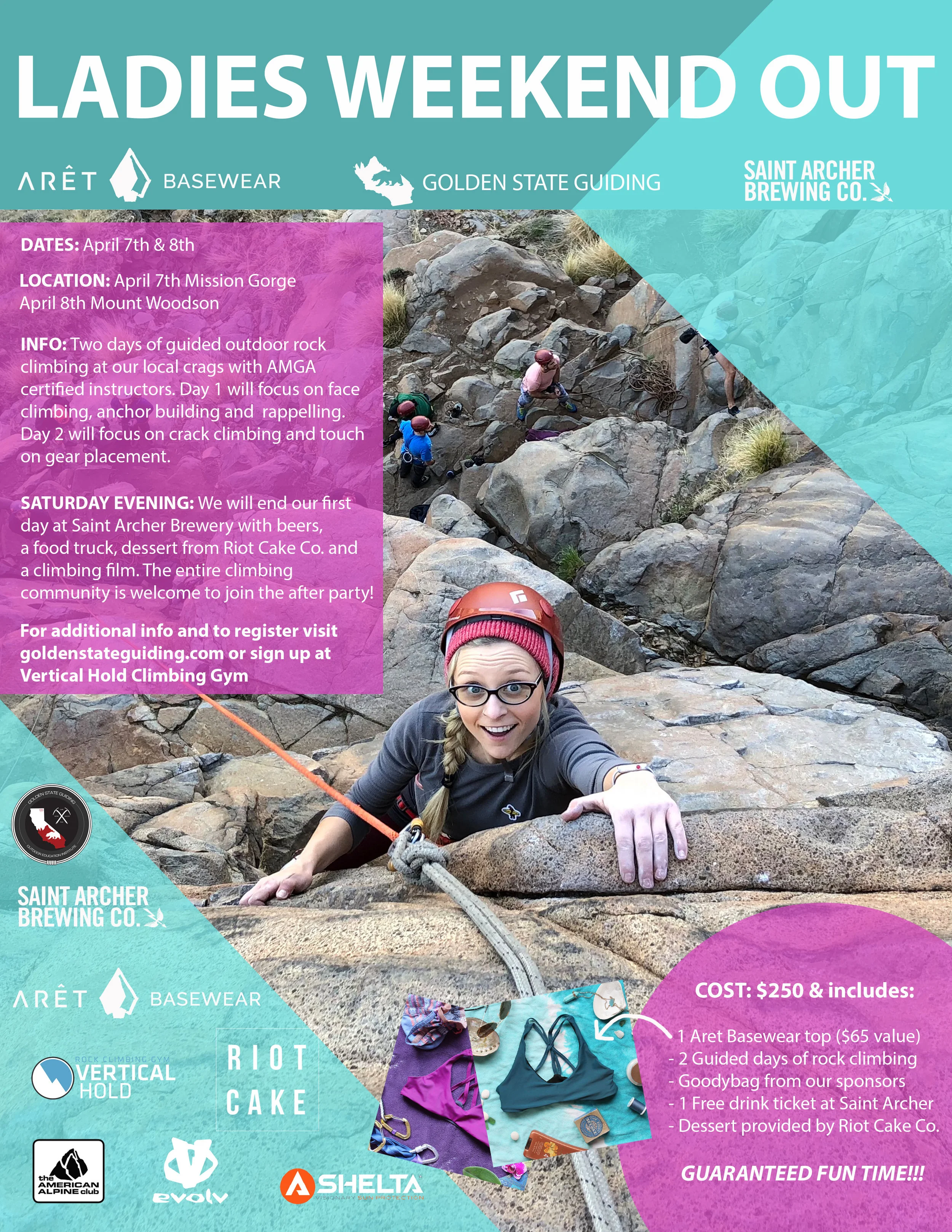 Golden State Guiding has partnered up with Aret Basewear and Saint Archer Brewery for an all ladies weekend of climbing April 7th - 8th! Twelve lucky ladies will have the opportunity to climb some of San Diego's most popular rock climbing crags with our AMGA certified guides. We'll focus on the fundamentals of climbing techniques and best practices, building safe and efficient top rope anchors and rappelling with backups to make sure you have your systems dialed for the next time you venture outdoors on your own.