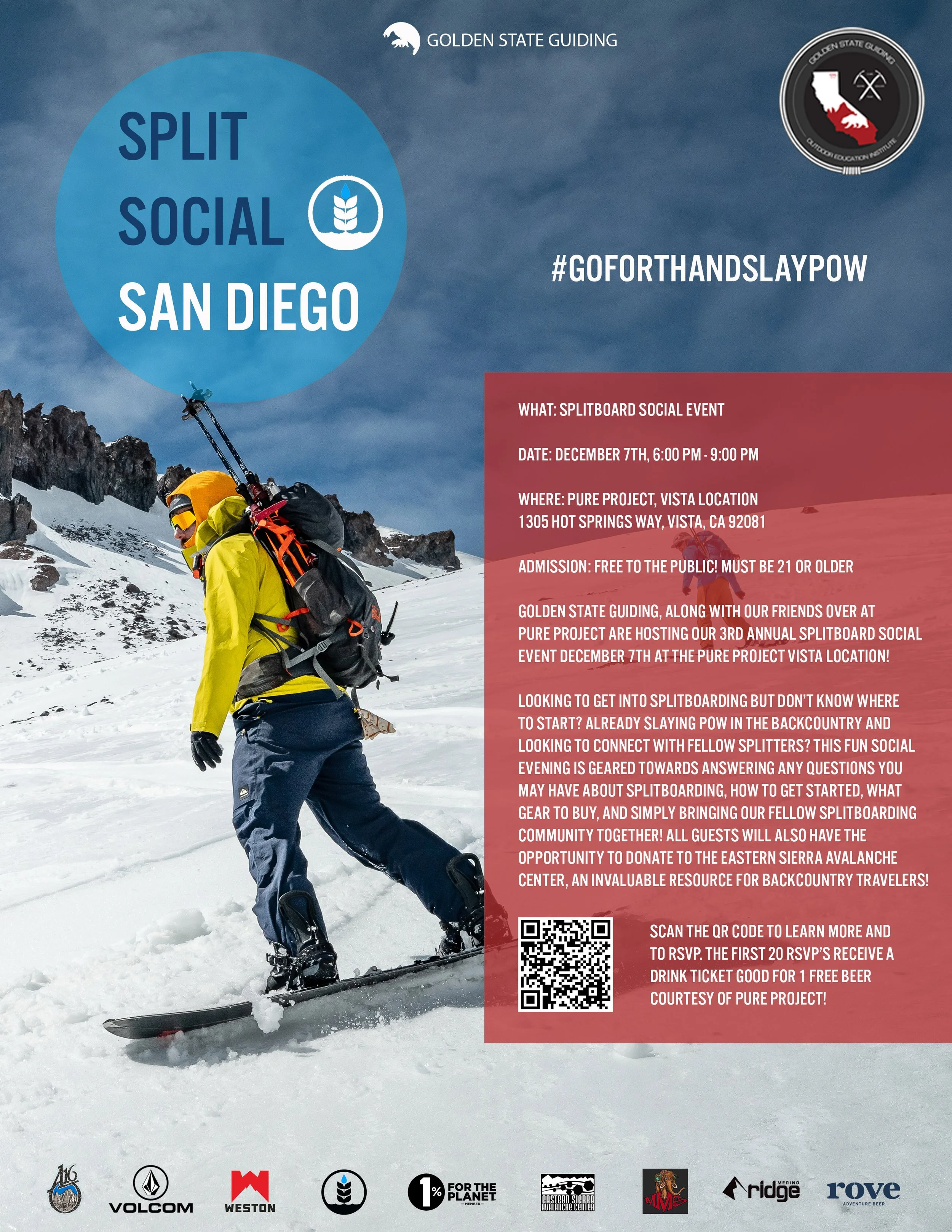 Golden State Guiding, along with our friends over at Pure Project, are hosting our 3rd annual Splitboard Social event in San Diego on December 7th from 6:00 pm - 9:00 pm at the Pure Project location in Vista!
