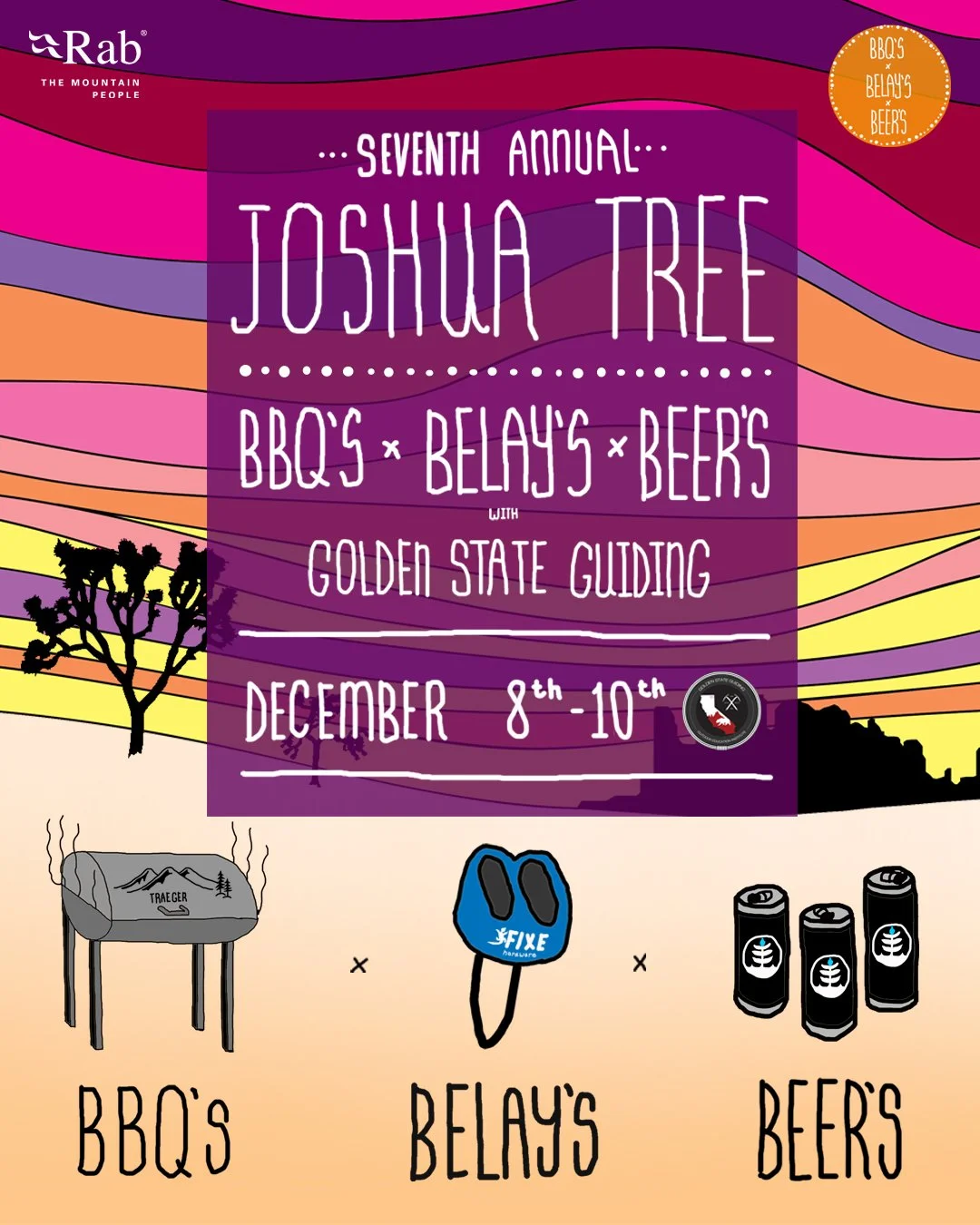 GSG has booked out a weekend this December in Joshua Tree National Park for our 7th annual BBQ's x BELAY's x BEER's event and we want you to come out and climb and camp with us! The weekend consist’s of 2 nights camping in Joshua Tree National Park, 2 days of guided climbing in the park, and one meal and refreshments (Saturday night) provided by Golden State Guiding, and our partners Traeger Grills, and Pure Project Brewing. All guests will also receive a goodybag from our partners Rab Equipment, Shelta Hats, and the American Alpine Club! Don't miss this great opportunity to climb with GSG's, AMGA certified guides and experience Joshua Tree in a very special way. Click the button for more details and to register for BBQ’s x BELAY’s x BEER’s today!